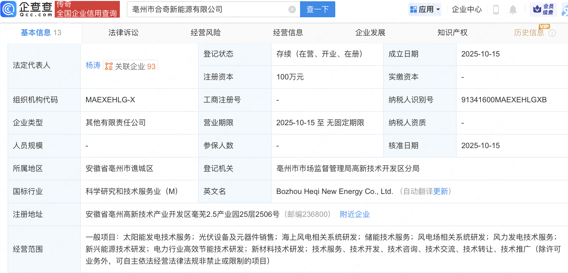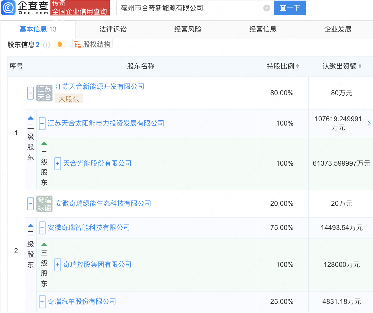 近日,亳州市合奇新能源有限公司成立,法定代表人为杨涛,经营范围包含:太阳能发电技术服务;光伏设备及元器件销售;海上风电相关系统研发;储能技术服务等。企查查股权穿透显示,该公司由天合光能(688599)旗下江苏天合新能源开发有限公司、奇瑞关联公司安徽奇瑞绿能生态科技有限公司共同持股。