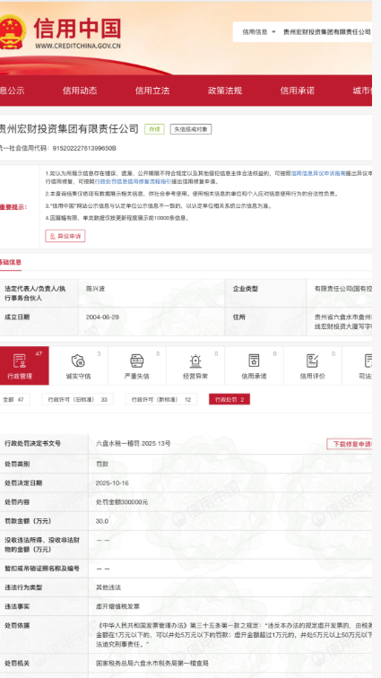 近日,国家税务总局六盘水市税务局第一稽查局对贵州宏财投资集团有限责任公司作出行政处罚决定,因其涉及虚开增值税发票的违法行为,处以罚款30万元。该处罚决定书文号为“六盘水税一稽罚﹝2025﹞13号”,处罚决定日期为2025年10月16日。
